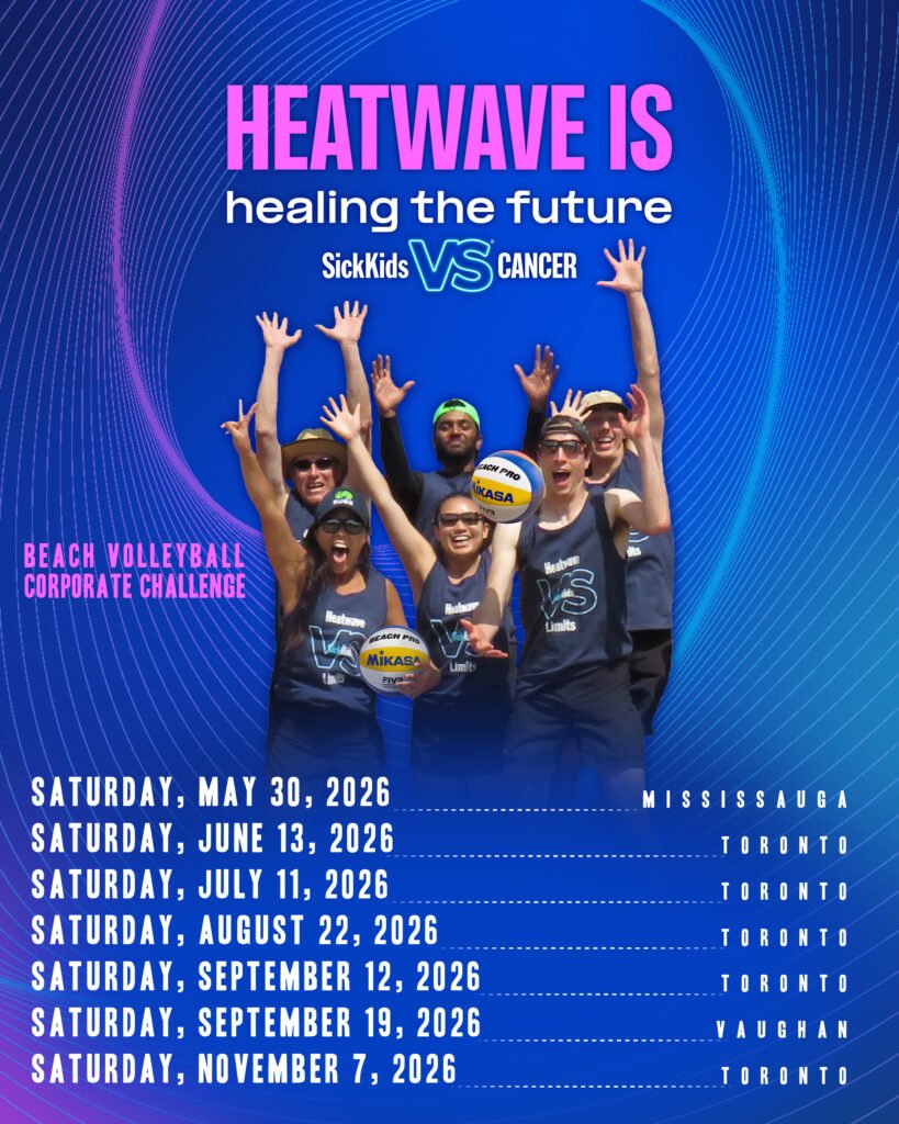 Welcome to Heatwave for SickKids 2026, Canada’s most exciting corporate beach volleyball charity challenge! Celebrating over 32 years of teamwork, energy, and community spirit, Heatwave brings together companies and colleagues for an unforgettable experience that makes a lasting difference. Each serve, spike, and rally helps support the SickKids Foundation, funding vital research, treatments, and the fight against childhood cancer. With multiple tournament dates across Toronto, Mississauga and Vaughan, as well as a grand Indoor beach finale at Volleyball Canada High Performance Indoor Beach Facility, there’s an event for every team ready to get involved. Whether you’re joining for fun or competition, Coed 6’s divisions offer a thrilling mix of recreation, networking, and philanthropy. It’s more than just a game—it’s a movement to Heal the Future. Through Heatwave’s Corporate Team Building program, teams can strengthen communication, leadership, and camaraderie while giving back. Wear your company colors proudly, bring your banner, and join hundreds of businesses committed to positive change. Don’t miss the chance to Tell Childhood Cancer to Get Spiked! Be part of an incredible legacy that unites sport, charity, and community. Registration is now open—limited spots are available for 2026. Gather your team, get ready to play, and join Heatwave as we go beyond the court to make an impact that lasts a lifetime.